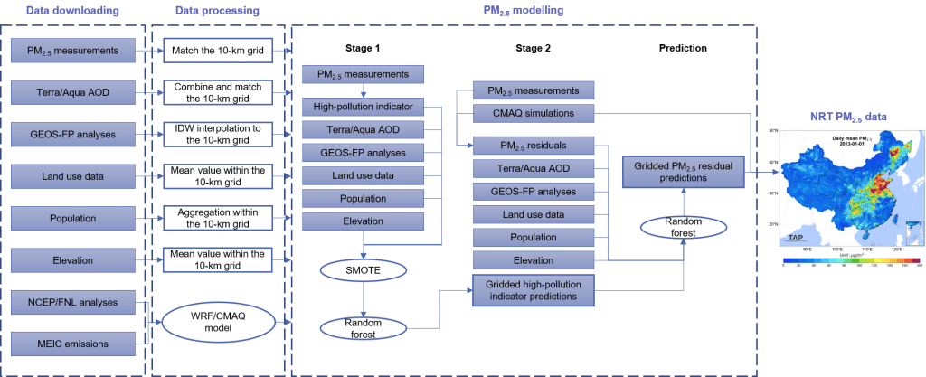 TAP developed a two-stage machine learning model to predict daily PM2.5 concentrations with complete spatial coverage. The structure of our model is shown below. The data sources include PM2.5 measurements, satellite AOD (aerosol optical depth) retrievals, online CMAQ simulations, meteorological reanalysis data, land use information, and population distribution. The first-stage model predicts the high pollution events and employed the SMOTE algorithm to resample the model training data, thus balanced the proportion of high pollution events and normal events in the model training dataset. The first-stage random forest model trained with the resampled data predicts high pollution events. The second-stage model predicts the residual between CMAQ PM2.5 simulations and PM2.5 measurements with random forest. The prediction of residual rather than the prediction of PM2.5 enlarged the response of predictions to variations in predictors, thus improved the prediction accuracy. The missingness in satellite retrievals was filled by decision-tree based modeling algorithm.